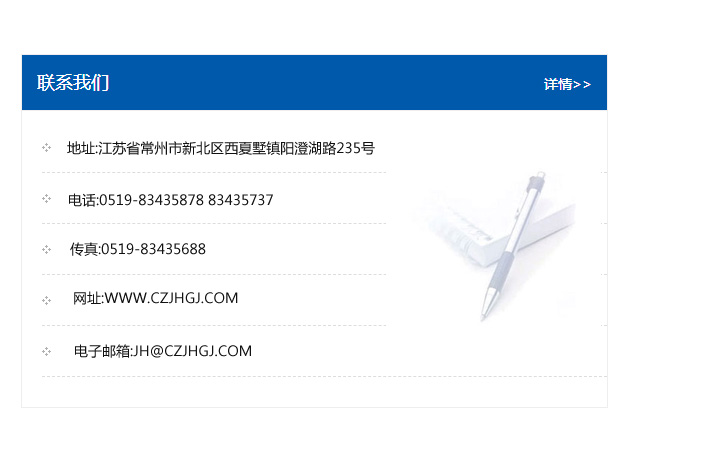 地址:常州市新北區友邦商務大廈1幢16、17層  電話:0519-85101652  傳真:0519-85112595  郵編:213022  網址:www.cz-jiayue_cn.fenxiaocn.com  郵箱:xiajifengaa@163.com